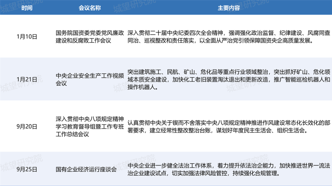 从2025年经济运行与安全生产系列会议来看,以全面从严治党引领保障国资央企高质量发展,要求积极统筹发展与安全,强化重点领域风险排查,持续强化合规管理。
