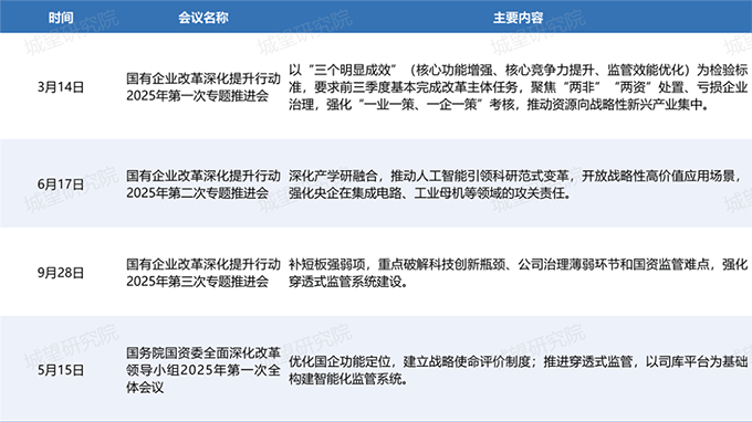 从2025年改革深化提升行动系列会议来看,各项会议以“十四五”收官为契机,深化国企功能定位优化、科技创新突破、穿透式监管升级,推动改革从“任务驱动”转向“成效驱动”,统筹好“放得活”和“管得住”,推动国有资本和国有企业做强做优做大,增强核心功能、提升核心竞争力,更好履行战略使命。