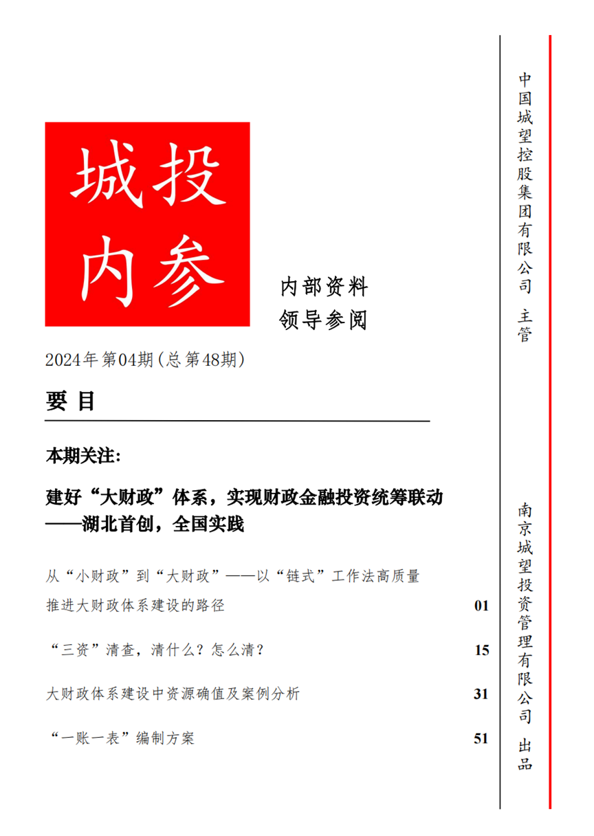自2024年初率先提出大财政体系建设理念以来,湖北各地迅速行动,以制度创新打破部门壁垒,用市场思维激活沉睡资产。“大财政”体系建设的理论逻辑、实践路径和案例分析,已由城望集团专业团队系统梳理并收录于我公司出品的《建好“大财政”体系,实现财政金融投资统筹联动——湖北首创,全国实践》2024年第04期(总第48期)内参中,为各地推进国有“三资”改革提供了可复制的操作指南(文末附资料获取方式)。