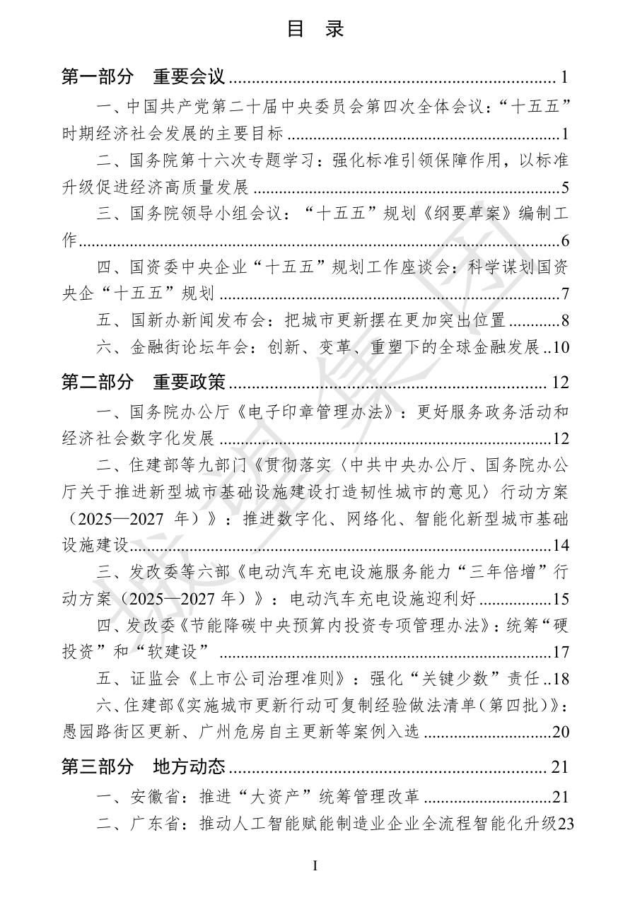 2025年10月20日至23日,中国共产党第二十届中央委员会第四次全体会议如期召开。全会听取和讨论了习近平受中央政治局委托所作的工作报告,审议通过了《中共中央关于制定国民经济和社会发展第十五个五年规划的建议》。习近平就《建议(讨论稿)》向全会作了说明。 全会提出了“十五五”时期经济社会发展的主要目标:高质量发展取得显著成效,科技自立自强水平大幅提高,进一步全面深化改革取得新突破,社会文明程度明显提升,人民生活品质不断提高,美丽中国建设取得新的重大进展,国家安全屏障更加巩固。在此基础上再奋斗五年,到二〇三五年实现我国经济实力、科技实力、国防实力、综合国力和国际影响力大幅跃升,人均国内生产总值达到中等发达国家水平,人民生活更加幸福美好,基本实现社会主义现代化。 全会提出,建设现代化产业体系,巩固壮大实体经济根基。加快高水平科技自立自强,引领发展新质生产力。建设强大国内市场,加快构建新发展格局。加快构建高水平社会主义市场经济体制,增强高质量发展动力。扩大高水平对外开放,开创合作共赢新局面。加快农业农村现代化,扎实推进乡村全面振兴。优化区域经济布局,促进区域协调发展。激发全民族文化创新创造活力,繁荣发展社会主义文化。加大保障和改善民生力度,扎实推进全体人民共同富裕。加快经济社会发展全面绿色转型,建设美丽中国。推进国家安全体系和能力现代化,建设更高水平平安中国。如期实现建军一百年奋斗目标,高质量推进国防和军队现代化。 全会强调,全党全国各族人民团结起来为实现“十五五”规划而奋斗。坚持以党的自我革命引领社会革命,持之以恒推进全面从严治党,增强党的政治领导力、思想引领力、群众组织力、社会号召力,提高党领导经济社会发展能力和水平,为推进中国式现代化凝聚磅礴力量。要坚持和加强党中央集中统一领导,推进社会主义民主法治建设,充分调动全社会投身中国式现代化建设的积极性主动性创造性。促进香港、澳门长期繁荣稳定,推动两岸关系和平发展、推进祖国统一大业,推动构建人类命运共同体。 10月24日,中共中央政治局常委、国务院总理李强主持召开国务院“十五五”规划《纲要草案》编制工作领导小组会议并作讲话。 会上,国家发展改革委就纲要草案编制作了汇报,与会同志进行了讨论。李强说,习近平总书记在党的二十届四中全会上的重要讲话,为做好纲要草案编制工作提供了根本遵循。《中共中央关于制定国民经济和社会发展第十五个五年规划的建议》明确提出了“十五五”时期经济社会发展的指导思想、基本原则、主要目标、战略任务等,是指导“十五五”时期经济社会发展的纲领性文件。我们要深入学习领会习近平总书记重要讲话精神和党中央决策部署,在纲要草案编制中全面深入地贯彻落实。 李强指出,编制纲要草案要紧紧围绕新时代新征程党的中心任务,强化发展意识,坚持以推动高质量发展为主题,在壮大新质生产力、建设现代化产业体系等方面取得更大突破,推动经济实现质的有效提升和量的合理增长。要强化全局思维,准确把握“十五五”发展所处的历史方位,准确把握国内国际两个大局,保持战略定力,充分估计可能的外部冲击、做好应对准备,牢牢把握发展主动权。要创新思路、务求实效,高质量编制规划纲要,进一步明确“十五五”发展的施工图、路线图,谋划提出务实管用的发展载体和工作抓手。 李强强调,纲要草案编制时间紧、任务重,各方面要密切协作、形成合力。要面向社会公众公开征集意见建议,广泛了解社会期盼、专家意见、基层经验等,认真研究吸纳到纲要草案中。要加强统筹协调,做好专项规划编制与国家发展规划的衔接,指导地方立足比较优势编制规划,形成科学有机的规划体系。 10月11日,住房城乡建设部部长倪虹在国新办举行的“高质量完成‘十四五’规划”系列主题新闻发布会上表示,目前,全国各地区、各部门都在深入学习贯彻中央城市工作会议精神,合力推进部署任务的落实落地。住建部将会同有关部门在《关于推动城市高质量发展的意见》基础上,研究制定若干个配套文件。作为落实会议精神的主责部门,住建部将重点抓的第一件事就是高质量开展城市更新,把城市更新摆在更加突出的位置,系统推进好房子、好小区、好社区、好城区“四好”建设。 住房城乡建设部副部长董建国介绍,“十四五”期间,构建房地产发展新模式这项工作取得了积极进展。一是完善住房供应体系;二是建立“人、房、地、钱”要素联动机制;三是改革完善房地产开发、融资、销售制度;四是发展安全、舒适、绿色、智慧的“好房子”。 董建国说,构建新模式是为了推动房地产高质量发展,房地产高质量发展归根到底是要让人民群众住上“好房子”。住建部指导各地全链条提升住房标准、设计、材料、建造、运维水平,首先把保障房建成“好房子”,同时,不仅将新房子建成“好房子”,还要将老房子改造成“好房子”。 近日,住建部、国家发改委、工信部等9部门联合发布《贯彻落实<中共中央办公厅、国务院办公厅关于推进新型城市基础设施建设打造韧性城市的意见>行动方案(2025—2027年)》(以下简称《行动方案》),推进数字化、网络化、智能化新型城市基础设施建设,增强城