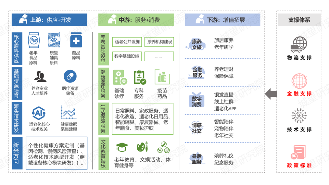从“银发经济”产业链全景图来看(图1),银发经济全产业链以老年人老年阶段、未老阶段的全生命周期需求为核心,覆盖从老年群体日常刚需到精神追求的全场景需求。