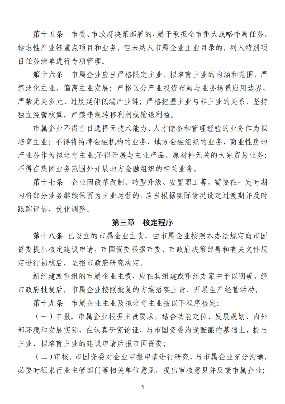 1月28日,从济南市政府新闻办召开的新闻发布会获悉,2024年9月9日,市政府办公厅印发了《济南市市属企业主责主业管理办法》(以下简称《办法》),《办法》对主责主业管理原则、核定标准、核定程序、监督管理、责任追究等方面进行了进一步的明确和规范,为推进济南市国有经济布局优化和结构调整、不断提升济南市国有企业核心竞争力提供了强有力的政策支持。按照该政策,市属企业主业所涉及的资产总额、营业收入和利润总额,至少一项指标合计占企业总量原则上近3年平均不低于70%,单个主业原则上不低于10%。《办法》的主要内容共分6章44条,包括总则、核定标准、核定程序、监督管理、责任追究、附则。第一章总则,主要包括制订目的,适用范围,主责、主业、拟培育主业和非主业的定义等。第二章核定标准,主要规范了主责、主业、拟培育主业的核定依据和要求,主业经营指标标准和主业数量等,其中,主业名称主要参照《国民经济行业分类》等国家标准性文件制定;主业所涉及的资产总额、营业收入和利润总额,至少一项指标合计占企业总量原则上近3年平均不低于70%,单个主业原则上不低于10%。第三章核定程序,主要规定了企业主责、主业的核定程序。其中,企业主责由市政府制定或批准;企业主业由市国资委审核批准,分申报、审核、核定三个步骤。第四章监督管理,主要是建立主责主业动态调整、信息化日常监控和年度监测工作机制。实现主业穿透式管理,全级次企业均制定主业清单。推动主业和投资联动管理,严控非主业投资,竞争类、功能类、公益类企业非主业投资比例不超过年度投资计划的5%、3%、2%。做好存量资产管理,存量主业资产进行专业化整合,存量非主业资产分类管理,推动资源要素向主业集中。丰富监管措施手段,以激励约束措施为抓手,推动市国资委内部监督与外部监督形成合力,提升监督实效。第五章责任追究,市国资委建立健全主责主业管理工作责任追究机制,对日常管理不力、申报资料虚假、问题整改不到位、非主业投资不合规的,按照有关规定和相应的职责权限,对企业相关责任人给予处理、处分;造成国资损失或重大影响的,按照《企业国有资产法》和《市属企业违规经营投资责任追究实施办法(试行)》等有关法律和规定,严肃追究企业相关人员的责任。第六章附则,要求市属企业根据本办法制定企业主责主业管理制度。各区县(功能区)和文化类、金融类企业可参照本办法制定或执行相关制度。